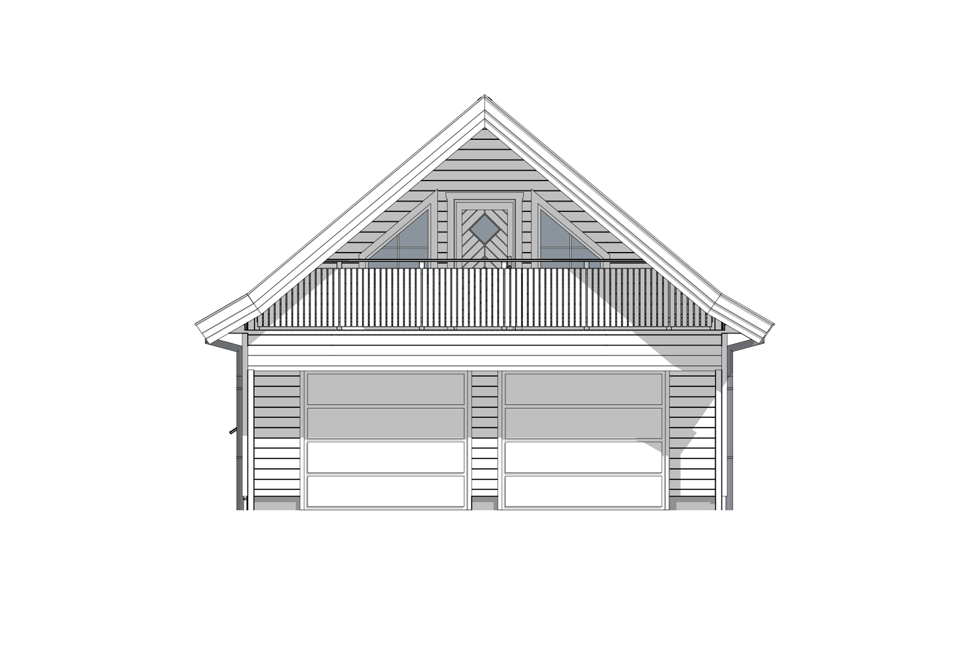 Garasjen inneholder et garasjerom i første etasje med en fradelt bod i bakkant av rommet. Garasjen har to garasjeporter, en praktisk dør i bakkant og vinduer for godt lysinnslipp.